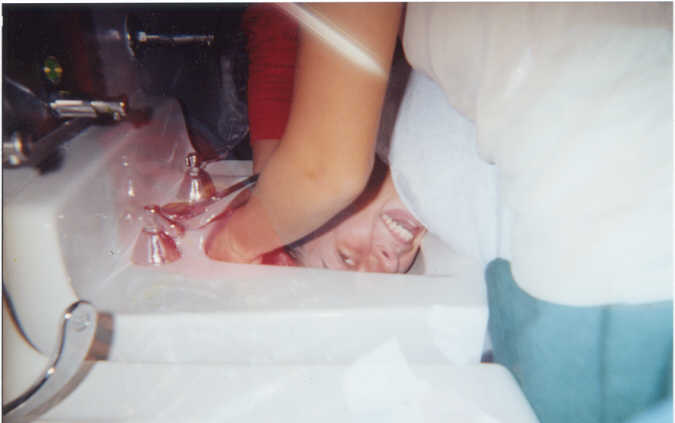 | i dyed my hair in the bathroom at nationals. we always stay at this skool so theres plenty of facilities. kate mcilvain and meagan karagias dyed my hair. and liz santori took pictures. the bottom one is them rinsing it out.. the sink was conveniently the size of my head.. i think my eyes were burning with dye water in that picture.. oh well.. good times.. and how many people can say they've dyed their hair in a skool bathroom at one oclock in the morning? i know i can... |