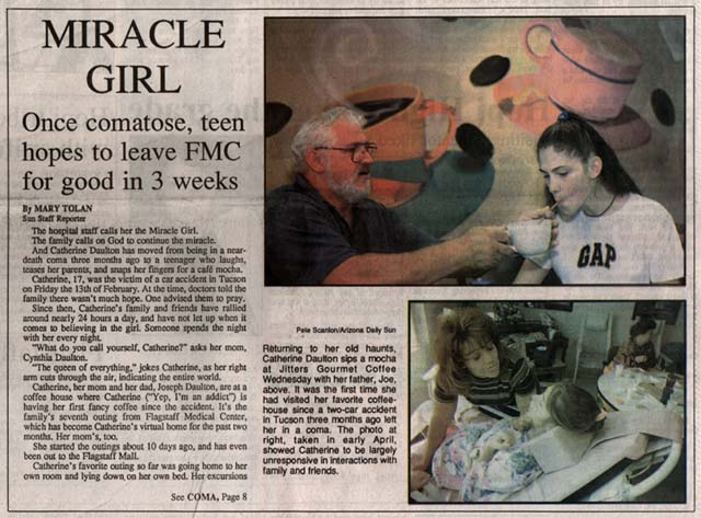 Wednesday, we met with the reporter and photographer from the Arizona Daily Sun at Jitters, a coffee house Catherine always enjoyed. She tried a mocha with hazelnut and vanilla at the recommendation of one of her therapists and thoroughly enjoyed it. A follow up story is supposed to run in Sunday's paper.