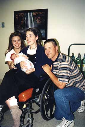 Catherine, with brother Steve and his wife Joy, holding her niece who was born 5 weeks premature, put on life support, and not expected to live, meet for the first time on 5-23-98. This miracle baby, Gabrielle Ruth, shares her aunt's middle name. Another miracle for the Daulton family! |