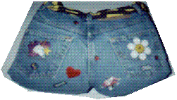 Cut both legs off of jeans about 3" from crotch of pants. Place patches randomly on back of jeans and iron-on according to patch instructions. Turn jeans inside out and sew legs closed, rounding into pillow shape as sewing. Turn jeans right side out and sew top of jeans closed. Stuff jeans with the fiberfill through the zipper, close zipper. Thread bandanna through belt loops and tie in front.