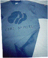 Enlarge the three faces emblem to approximately and 8x10 size. Trace onto contact paper backwards and cut out. Do the same for the letters GIRL SCOUTS (about 2" in height). Remember to trace pattern pieces on backwards on the contact paper. Take backing off of contact paper and place clear pieces onto the shirt in the center.