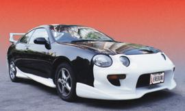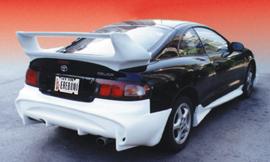 | This is a great example of a factory Celica with add on ground effects. The front bumper and side skirts are painted white while the rest of the car is black. | Here you can see how much of a modification getting a new rear bumper is. All the white stuff is new on the car. Spoiler, bumper, side skirts all look nice. |