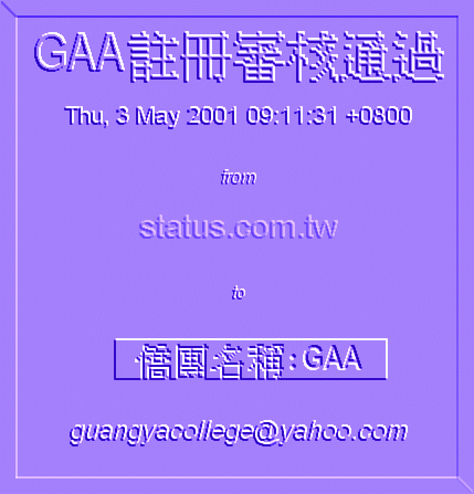 Public Relations : Registration Registration status.com.tw REGISTRATION home (C)GAA - an English-Chinese bilingual site. Contact: James Young GC BA, guangyacollege@yahoo.com