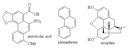 從化學結構的觀點來看,馬兜鈴酸(aristolochic acid)蠻特別的,它具有一個硝基(NO2),這在天然有機化合物中並不常見; 三個苯環並排成彎角狀,稱為菲(phenanthrene),嗎啡(morphine)也可視為含有這個骨架;除此之外,這個化合物也具有苦味、能使兔耳的血管收縮、提高吞噬細胞的活力。