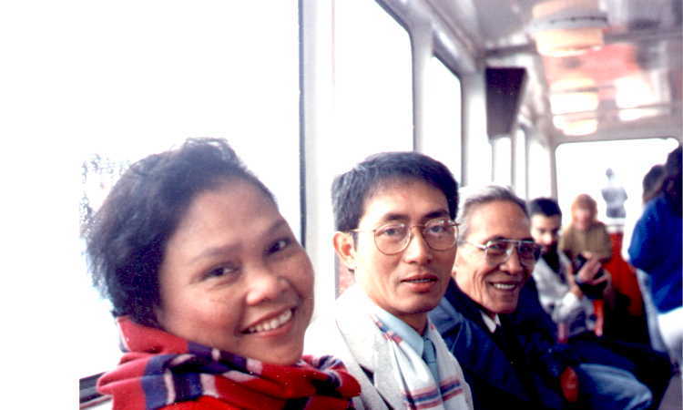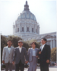 | Our youngest brother, John Taco Sabio and wife, Natalia Memije Sabio, residing in California, wholeheartedly assisted Tatay in the processing of his application for citizenship until the oath-taking day arrived. Above is a snapshot of Tatay with John and Naty taking a cruise on board a tourist pleasure boat around the scenic San Francisco Bay of California. He enjoyed very much his stay in the U.S.A. The picture on the right was taken in front of the City Hall of San Francisco, California during the visit of Fr. Raymond T. Sabio, MSC in 1993. |