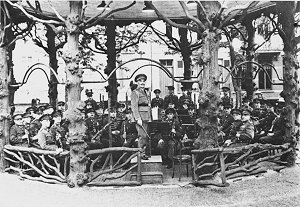 Hieronder, het laatste concert van de muziekkapel van het 11de Linie Regiment. Het werd volgens traditie gegeven op de kiosk van het Leopoldplein. De leiding had kapitein-muziekoverste A. Lefèbre.