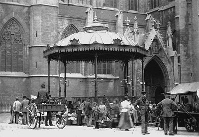 Deze kiosk, die iets groter lijkt, werd samen met twee kiosken voor Namen gebouwd in 1898, door François Storder constructeur-mécanicien te Bouvignes. Het waren verplaatsbare kiosken "op wielen". In Dinant stond ze afwisselend op de Grand Place, zoals hier op de foto te zien is, en op de "Place de Meuse" Bron : Les kioskes à musique, Qualité-Village-Wallonie, 1992