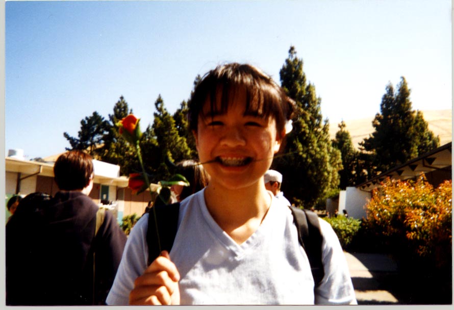 here's a recent picture of me. my friend cherry took it on the last day of school. my hair looks all funky because i was going for my ever so popular chun-li look. yep, hi-ya...watch out =) i'm hecka buff. hm, nice roses huh? =) ko, i am putting this picture up because my friend joanna suggested that i do so because she said that i look cute in it. sure sure...right....=) well it's the only recent picture i have scanned. *shrug* so i thought why not. teehee, it looks like i have a halo in this picture. how cool! =)