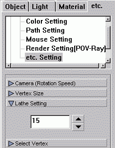 One point of the newly added line should still be selected. Select - Connected and (if it is not already opened) open the Dialog Window by choosing Window - Dialog Window from the menu. Click the etc. tab and in the white option area click the + beside Configuration then choose etc. Setings and type 15 in the entry field for Lathe Setting which will appear in the gray expanding options area.