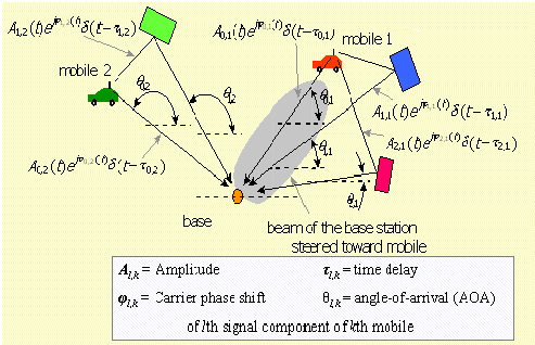 ![]() The antenna works by steering a beam to each mobile user when it is needed; the antenna also forms nulls in directions of strong interference.Both the beams on the wanted user and the nulls on interference sources track moving sources. Smart Antennas in CDMA .............................................................................. 1. Channel Modelling Considerations - Modelling the Received Signal