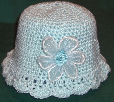 Hand crocheted child's mint green hat. It is accented with a matching mint green clip-on flower and has a beautiful shell edge. This hat is 100% acrylic. Size: 20". Order item: HK117. Price: $10.00. Two available in case you have twins! |
