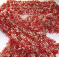 Hand crocheted tan, cream, and red scarf. This loopy, furry scarf is 90% mohair, 5% wool, and 5% nylon. It is 4-1/2" wide by 60" long. Order Item S46. Price: $30.00. |