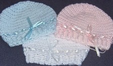Hand crocheted newborn hat. 100% acrylic. Very soft. Size: 12". Color: Available in colors to match the baby blanket. Order item: BH1, Specify color of hat and ribbon. Price: $6.00.
