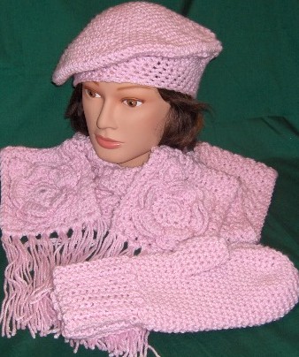 Soft and cozy pink hand crocheted 3-piece set. The beret fits 18"to 22". Order #HK58. The mittens are long to keep your wrists warm. Order #MS01. The scarf is 68" long and 5-1/2" wide. The fringe is 8" long. It features a hand crocheted flower on each end. Order item: S19. This set is 100% acrylic. Price $27.00 for the set. |