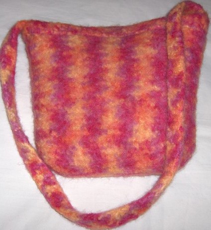 Hand crocheted soft, fluffy, purse in varying shades of pink and purple. This purse is nylon and polyester. It's 7" wide by 6-1/2" high and the handle is 34" long. It has a button and loop closure. Order item #CPBT20. Price: $16.00. |