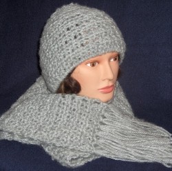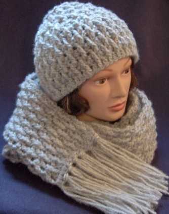 Hand crocheted reversible, silvery gray, hat and scarf set. They are 100% acrylic with the look and feel of wool, but are machine wash and dry. The hat is 22-23" and the scarf is 4-1/2" wide by 74" long with a 6" fringe on the ends. Order item: HK137. Price: $30.00. |