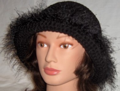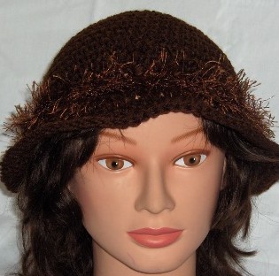 Hand crocheted dark brown hat trimmed with a "glittery" dark brown fun fur hat band. The hat is 100% acrylic and the fun fur hat band is 100% polyester. Size: 28" around. Order item: HK74. Price: $11.00. |
