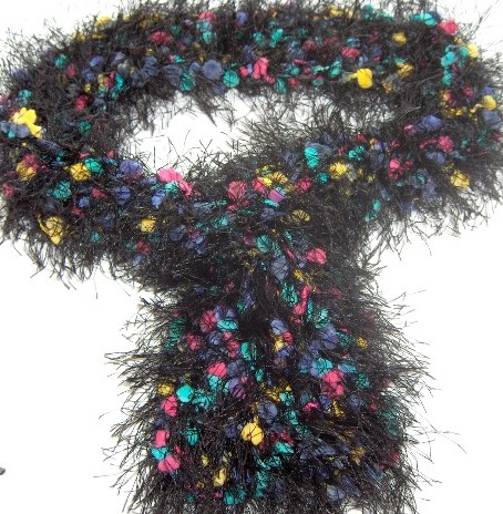 Hand crocheted scarf in black fancy fur yarn with kernels of color. This scarf is very unique. You put the wide end through a loop on the narrow end and put it around your neck. Then you can make the scarf longer or shorter. This scarf is 4" wide for 7" and then narrows down to 2" and it's 30" long. Scarf is 100%polyester. Order item S33. Price: $18.00. |