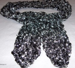 Hand crocheted beautiful, black and white scarf. This yarn gives the scarf an interesting texture and looks like it's made with ribbons. Both ends are tapered. The scarf is 2-1/2" wide and 46" long. It is 100% nylon. Order item: S32. Price: $18.00. |