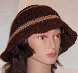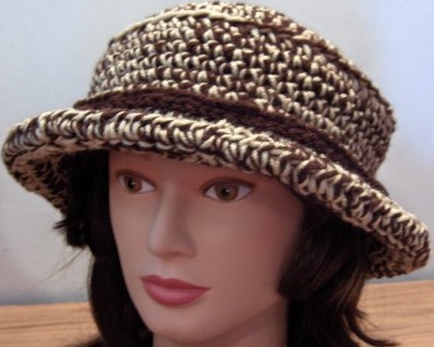 Men's or women's hand crocheted tan and dark brown hat with rolled brim. This hat is made holding 2 strands of yarn together so it holds its shape. This hat is accented with a hand crocheted dark brown hat band. The hat and band are both 100% acrylic. Size: large, fits heads up to 28". Order item: HK82. Price: $22.00. |