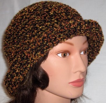Hand crocheted thick and warm, nubby, black and brown rolled brim hat. Size: 24" around. Order item: HK130. Price $10.00 |