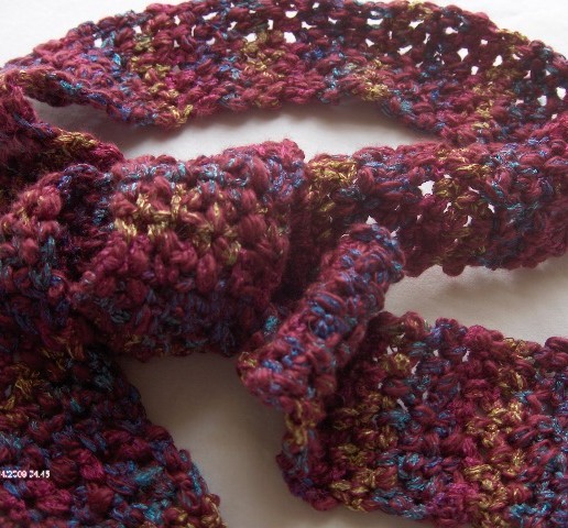 Hand crocheted beautiful, burgundy scarf accented with subtle colors of blue and golden yellow. This soft scarf is 3" wide and 35" long with 5" long fringe. It is 79% acrylic and 21% polyester. Order item S42. Price: $25.00. |