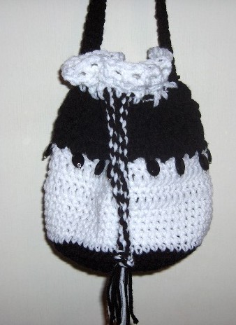 Hand crocheted black and white drawstring bag. This purse is 9"wide by 11" high. It is accented with hand sewn black beads and tiny white pearls. The crocheted black handle is 20" long. The yarn is 100% acrylic. Order item #CPBT27. Price: $18.00. |