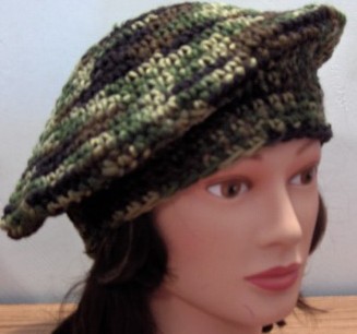 Hand crocheted, green/brown camouflage beret. 100% acrylic. Size: Fits heads 22"-24". Order item: HK66. Price: $10.00. (I can duplicate these berets. 5 available in this camo now.) |