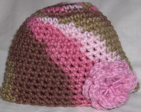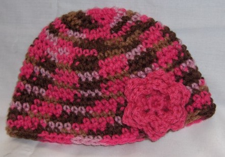 Hand crocheted pink and brown variegated head-hugger hat with hand crocheted pink flower. 100% acrylic. Size: 3T-4T or 19" head. Order item: HK129. Price: $10.00. |