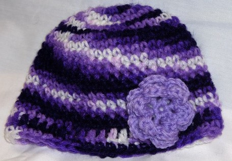 Hand crocheted purple variegated head-hugger hat with hand crocheted purple flower. 100% acrylic. Size:2T-3T or 18" head. ( 2 available.) Order item: HK128. Price: $10.00. |