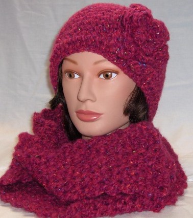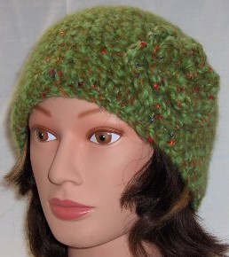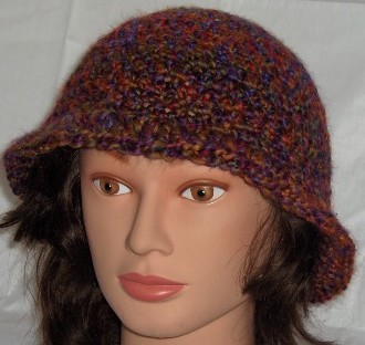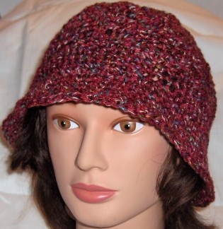 Cranberry tweed hand crocheted cloche. Six large crocheted petals create an unusual design in the top part of this hat. This hat is 100% acrylic. Size: 24". Order item: HK57. Price $15.00. |