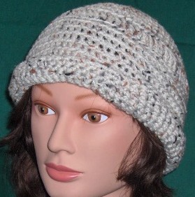 Hand crocheted double rolled brim hat. This hat is off-white with brown and black flecks. Size: 23". It is 100% acrylic. Order item: HK94. Price: $12.00. |