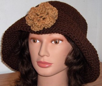 Hand crocheted dark brown floppy brim hat. This hat is accented with a warm brown hand crocheted flower. Hat and flower are 100% acrylic. Size: Adult, one size fits most. Order item: HK102. Price: $22.00. |