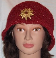 Hand crocheted deep red cloche. This hat has a metallic gold accent right in the yarn. It is 97.5 % acrylic and 2.5% metallic. Size: 26". DOES NOT INCLUDE GOLD PIN. Order item: HK110. Price $12.00 |