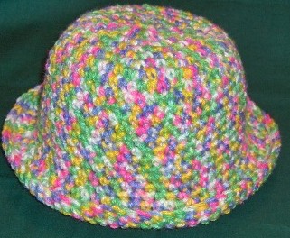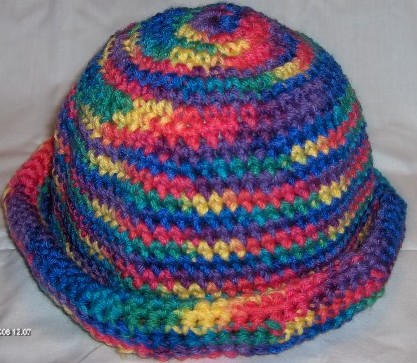 Hand crocheted child's double rolled brim hat. This hat blends bright colors and the brim can be worn rolled, down, or partially rolled. This hat is 100% acrylic. Size: 22". Order item: HK118. Price: $10.00. |