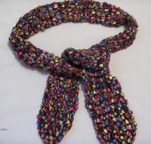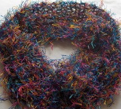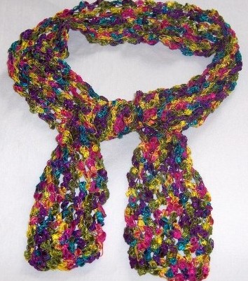 Hand crocheted scarf in bold purple, pink, green and turquoise It has an interesting texture and looks like it's made from ribbons. This scarf is 2-1/4" wide by 33" long. One end is square and the other end is rounded. Scarf is 100% polyester. Order item: S34. Price: $10.00. |