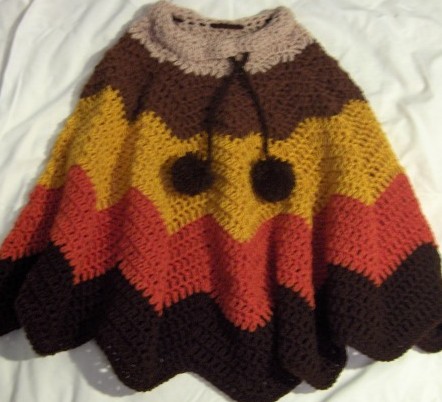 Hand crocheted elbow length ripple pattern cape. 100% acrylic. Color: beautiful fall shades of coffee, carrot, gold, medium brown, and tan. This cape is accented with coffee brown ties and pompoms. Size: L/1X. Price: $30.00. Order item: SP32. |