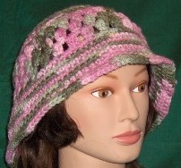 Hand crocheted pink camouflage cloche. This hat is 100% acrylic. It fits heads up to 28" and is 32" around at the brim. Order item: HK56. Price $12.00 |