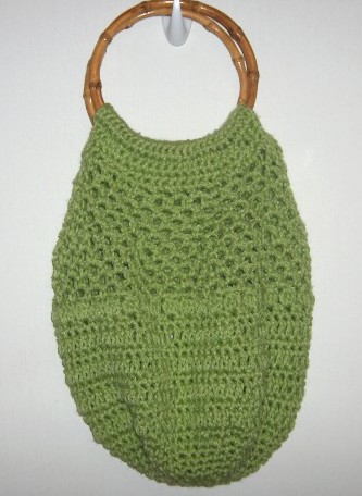 Hand crocheted pistachio hobo. This bag is 11" high by 11" wide and has a natural bamboo handle. The yarn is 100% acrylic. Order item #CPBT18. Price: $16.00. |
