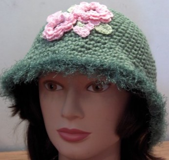 Hand crocheted sage green floppy brim hat with 3 hand crocheted 100% cotton roses with light green leaves. This hat is 100% breathable wool. Size: Adult, one size fits most. Order item: HK70. Price $22.00. |
