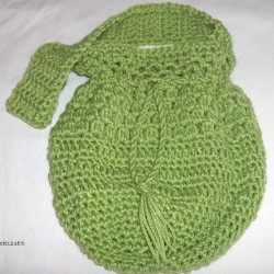 Hand crocheted pistachio drawstring hobo. This bag is 10" wide by 10" high and the handle is 20" long. A single drawstring pulls the purse shut and ends in a short tassel and silver peace symbol charm. Order item #CPBT25. Price: $12.00. |