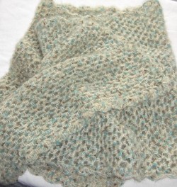 Soft and lightweight hand crocheted shawl. 50% mohair, 50% acrylic. This beautiful light green wrap is accented with flecks of black and turquoise. It is 15" wide by 58" long. Order item # SP40. Price: $24.00. |