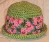 Hand crocheted child's rolled brim hat. It features pink and green multi-colored granny squares. This hat is 100% acrylic. Size: 21". Order item: HK95. Price: $10.00. |