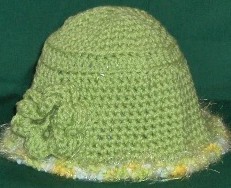 Hand crocheted pistachio green hat with matching flower. The edge of this hat is trimmed in white, green, and yellow fun fur. This hat is 100% acrylic and the trim is 100% nylon. Size: 23". Order item: HK96. Price: $10.00. |