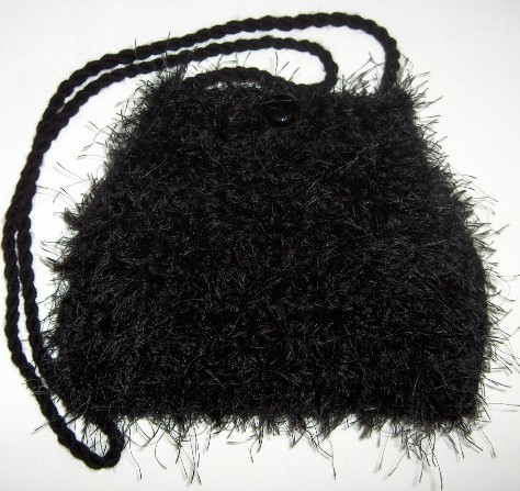 Hand crocheted fluffy little black bag. This purse is fluffy inside and out. It is 8" wide at the bottom, 5" wide at the top, and 6" high. It has a button and loop closure at the top. The twisted yarn handle is 34" long. Order item #CPBT21. Price: $15.00. |