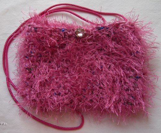 Hand crocheted fuzzy little pink bag. This purse is fuzzy inside and out. The fuzzy yarn has blue and black flecks. This bag is 7" wide by 5" high and the nylon cord handle is 40" long. This bag has a loop and pink jeweled button closure. Order item # CPBT22. Price: $15.00. |