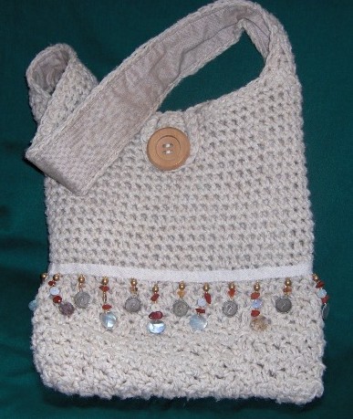 Hand crocheted natural hemp and cotton shoulder bag. The handle and bag are fully lined and there are 2 pockets inside. This bag is 10" wide by 11" high and has a loop and wooden button closure. The bag is trimmed all the way around with a row of dangling shells, stones, and coins. Order item # CPBT16. Price: $18.00. |
