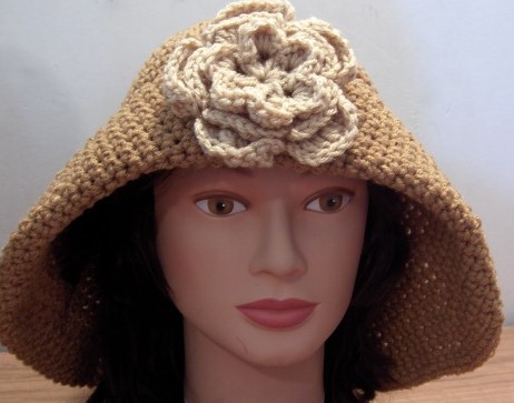 Hand crocheted earth brown floppy brim hat accented with hand crocheted tan flower. The hat and flower are 100% acrylic. Size: Adult one size fits most. Order item: HK101. Price: $22.00. (This hat does not have the same detailing on the top as the coral floppy brim hat seen above. This hat can also be ordered in your choice of colors for the hat and flower.) |