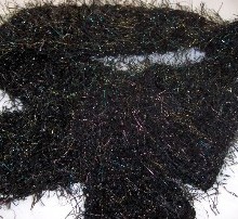 Hand crocheted black scarf with silver, gold, and turquoise metallic threads giving it a hairy look. It is 79% polyester, 15% rayon, and 6% nylon. This scarf is 3-1/2" wide by 54" long. Order S45. Price: $39.00. |