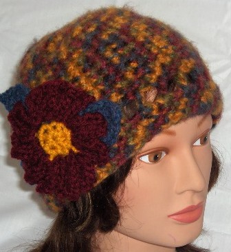 Hand crocheted mohair look skull cap. This warm hat has a mix of gold, burgundy, denim and olive green and is accented with a hand crocheted burgundy flower with a gold center and denim leaves. The hat and flower are 100% acrylic. Size: 24" around. Order item: HK51. Price: $12.00. |